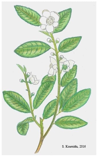 Tea is a popular drink worldwide. Cultivation of tea plants is economically important in many countries, and the tea plant, Camellia sinensis (Figure 1), is known to be grown in as many as 30 countries. Camellia sinensis grows best in certain tropical and subtropical regions [1]. There are four main types of tea produced from this same plant, depending on how the tea leaves are processed. These teas are white, green, Oolong, and black tea. White tea is produced from very young leaves and buds that have not yet turned green, and the only processing is drying. Green tea is produced from mature leaves with minimal processing (only drying). Oolong tea is produced from partially fermented mature leaves, and black tea is produced from fully fermented mature leaves [1,2]. Green tea, which makes up around 20% of tea production worldwide, is consumed most often in China, Korea, and Japan. Oolong tea is consumed most in China and Taiwan. Black tea (around 78% of tea production) is mostly consumed in the United States and the United Kingdom. Black tea contains up to three times the amount of caffeine as green tea [3,4,5].