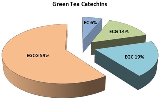 The components of green tea that are the most relevant medically are the polyphenols, with the flavonoids being the most important. The most pertinent flavonoids are the catechins, which make up 80%–90% of the flavonoids, and approximately 40% of the water-soluble solids in green tea [6,7,8]. The amount of catechins in the tea can be affected by which leaves are harvested, how the leaves are processed, and how the tea is prepared. In addition, where the leaves are grown (geographically) and the growing conditions affect catechin amounts [3,9,10,11,12]. Polyphenols are quickly oxidized after harvesting due to the enzyme polyphenol oxidase. To prevent loss of the polyphenols, green tea leaves are heated rapidly (most commonly by steaming or pan frying) to inactivate polyphenol oxidase. Black tea leaves are dried, then rolled and crushed, which promotes oxidation. Therefore, black tea has far fewer active catechins than green tea [1,2,5,8]. Green tea contains four main catechins: (−)-epicatechin (EC), (−)-epigallocatechin (EGC), (−)-epicatechin-3-gallate (ECG), and (−)-epigallocatechin-3-gallate (EGCG). The most abundant of these in green tea is EGCG, which represents around 59% of total catechins. The next most abundant is EGC (around 19%), then ECG (around 14%), and EC (around 6%) [2,3,8]. Figure 2 shows a representation of green tea catechin composition.
