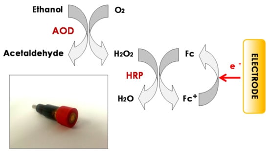 A stock 20% (v/v) ethanol (Scharlab) solution was prepared in 0.05 M phosphate buffer of pH 7.4. More diluted standards were prepared by suitable dilution with the same buffer solution, which was also used as supporting electrolyte. HRP (Type II from horseradish, EC 1.11.1.7, Sigma-Aldrich, 156 U·mg−1), AOD (from Pichia pastoris, EC 1.1.3.13, Sigma-Aldrich, 1.32 U·µL−1), and ferrocene (Fluka), were used for the preparation of ethanol biosensors. All chemicals used were of analytical-reagent grade and were used without further purification. Water was obtained from a Millipore Milli-Q purification system (ρ = 18.4 MΩ cm at 25 °C).