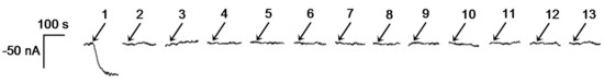 Amperometric responses recorded for 250 µL-aliquot additions of 0.002% (v/v) ethanol (1), 3 g·L−1 d-glucose (2), 3 g·L−1 d-fructose (3), 3 g·L−1 l-arabinose (4), 3 g·L−1 d-galactose (5), 3 g·L−1 maltose (6), 3 g·L−1 glycerol (7), 3 g·L−1 citric acid (8), 3 g·L−1 acetic acid (9), 3 g·L−1 succinic acid (10), 56 mg·L−1 l-malic acid (11), 58 mg·L−1 l-lactic acid (12), and 34 mg·L−1 ascorbic acid (13) standard solutions. Supporting electrolyte: 20 mL of 0.05 M phosphate buffer, pH 7.4. Eapp = 0.0 V vs. Ag/AgCl.
