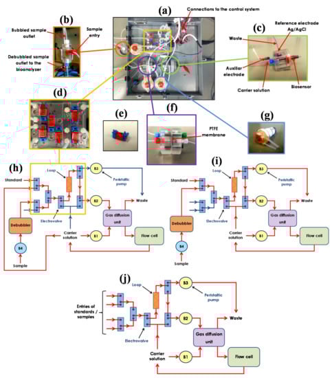Pictures of the ethanol automated bioanalyzer prototype: (a) top view, (b) de-bubbler unit, (c) cylindrical methacrylate electrochemical flow cell, (d) methacrylate plate with electrovalves for managing the hydrofluidics, (e) electrovalve, (f) gas diffusion unit, and (g) miniaturized peristaltic pump. Schemes of the flow system for on-line analysis of ethanol: (h) bioanalyzer working as CFA and (i) FIA systems, highlighting the active (―) and inactive (―) channels configured for the flow systems. (j) Scheme of the FIA system for off-line analysis of ethanol.