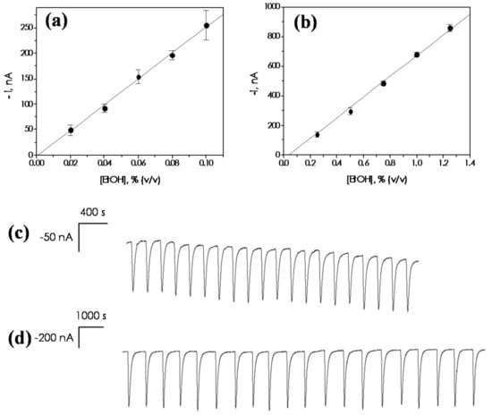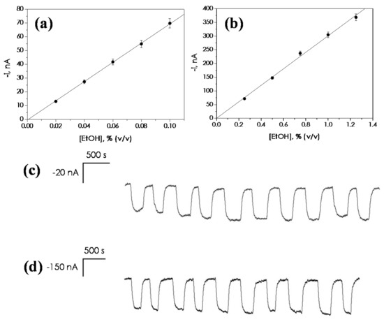 Calibration plots constructed for ethanol with the automated ethanol bioanalyzer working in the FIA on-line mode. Sampling unit equipped with one Teflon (PTFE) membrane of 0.45 µm pore diameter with (a) 20 mm and (b) 14 mm surface contact diameter. Successive amperometric responses recorded for ethanol standard solutions: 20 mm sampling unit, (c) ethanol 0.04% (v/v); (d) 14 mm sampling unit, ethanol 0.8% (v/v). Carrier solution: 0.05 M phosphate buffer, pH 7.4. Vi = 500 µL. Q = 4.0 mL·min−1. Eapp = 0.0 V vs. Ag/AgCl. Error bars estimated as triple of the standard deviation (n = 3).