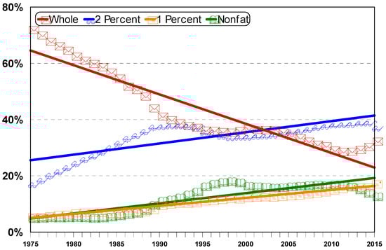 However, the evidence is that American consumers, by and large, have not heeded the recommendation. Figure 1 displays the 40-year trend in fluid milk sales in the US []. From 1975 to the early 1990s, whole milk sales plummeted as 2% milk sales increased while sales of other types of milk increased slightly during the late 1980s. In 1993, 2% milk sales exceeded whole milk sales for the first time and for the next decade whole and 2% milk sales were nearly identical. Since 2005, 2% milk sales have consistently surpassed whole milk sales. As of 2015, 1% low-fat and nonfat milk represents less than a third of all milk sales (30.0%), a figure that has not changed markedly during the last decade.