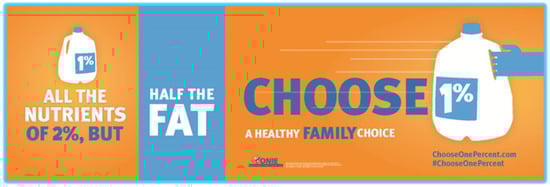 - Finnell, K.J.; John, R.; Thompson, D.M. 1% Low-Fat Milk has Perks!: An Evaluation of a Social Marketing Intervention. Prev. Med. Rep. 2017, 5, 144–149. [Google Scholar] [CrossRef] [PubMed]