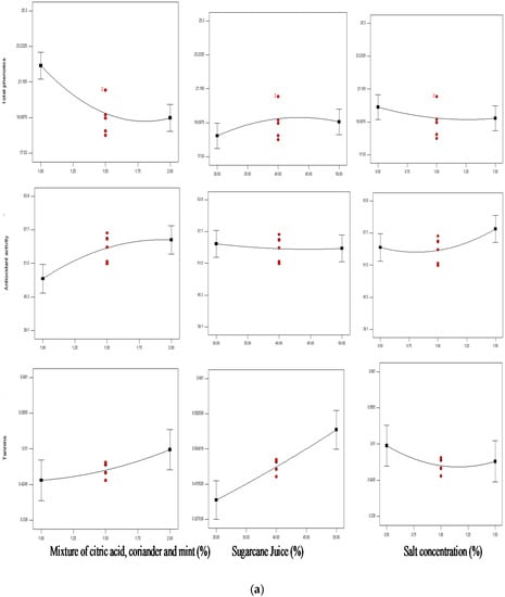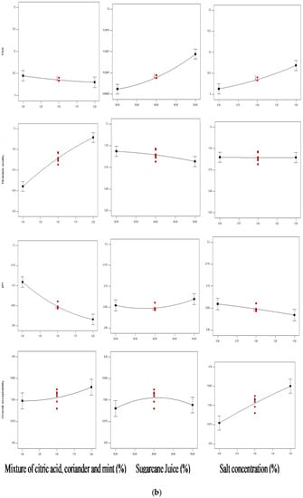 Figure 1b clearly shows that with the increase in sugarcane juice and salt concentration, there was a significant (p < 0.05) increase in TSS, which is due to the TSS of the sugarcane juice, i.e., 18.07–19.7 °Brix []. However, there was no significant contribution of spiced extract on TSS (Figure 1b); whereas, the increase in spiced extract concentration and sugarcane juice concentration resulted in a significant increase in the titratable acidity and a decrease in pH, which might be due to the contribution of the citric acid added into it (component of spice extract) and sugarcane juice [,,], respectively. The effect of salt concentration on titratable acidity was found to be non-significant (Figure 1b), but there was a significant decrease in the pH with the increase in salt concentration. The addition of salt significantly (p < 0.05) affected the sensory characteristics of spiced cucumber beverage (Figure 1b). With this, it was observed that the beverage was preferred with high a concentration of salt (1.5%). Table 2 also indicated that the interaction of salt and spiced extract exerted a positive impact on the overall acceptability due to proper blending of spiced extract and salt and made it more acceptable.