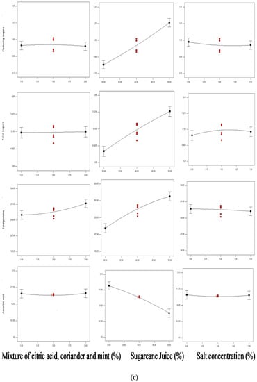 With an increase in sugarcane juice concentration (30–50%), a slight increase in the reducing sugars and a major change in total sugars were observed (Figure 1c). This increase in reducing sugars might be due to the conversion of sucrose to reducing sugars (glucose and fructose) primarily due to acids and higher temperature []. As sugarcane juice is a good source of total sugars, the amount of reducing sugars is very low as compared to the non-reducing sugars []. An increase in total sugars may be due to the degradation of complex polysaccharides like pectin and starch into simple sugars. Similar results have been observed by []: reducing sugars in juice significantly increase with the increase in the spiced extract concentration (Figure 1c). A significant increase in total proteins was observed with the increase in sugarcane concentration (Figure 1c), which might be due to the contribution of sugarcane juice, having total proteins ranging between 0.39 and 0.60%, as reported by []. A significant increase in total proteins due to the increase in the concentration of herbal extract (Figure 1) can be attributed to mint [,] and coriander extract [,]. With the increase in sugarcane juice concentration, there was a significant decrease in ascorbic acid content due to the low ascorbic acid concentration of sugarcane juice (3.35 mg/100 mL), as observed by [], in comparison to cucumber juice. However, the effect of the other two variables under study on ascorbic acid content was found to be non-significant (Figure 1c).