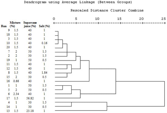 The data obtained from physico-chemical and sensory analyses of spiced cucumber juice were subjected to rescaled distance cluster analysis, and the results are shown in Figure 2. It is evident from the figure that there was the formation of two major clusters based on the concentration of the sugarcane juice. The first cluster comprises the herbal cucumber beverage developed by blending of 40–56.82% sugarcane juice; whereas, the second cluster comprises the herbal radish beverage prepared by blending of 23.18–30% sugarcane juice; which indicated that among all the variables under study, the concentration of sugarcane juice had a significant effect on the phyto-chemical, quality and nutritional characteristics of herbal cucumber beverage.