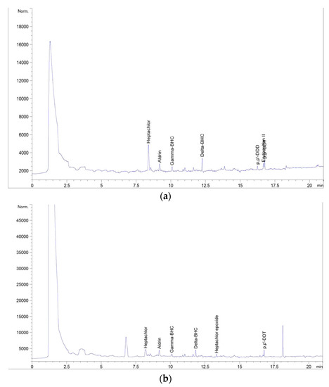 Figure 1a,b shows representative chromatograms of the samples. No interference peaks were obtained for the blank sample chromatogram at the same retention time as the target compounds. The mean recovery values for the spiked samples are shown in Table 1. The percent recovered range was between 81.7% (δ-BHC) and 92.5% (endosulfan II). The mean percentages for recoveries were within the 70–110% acceptable range for recovery, as stipulated by EU guidelines for evaluating accuracy and precision of a method [18], and thus show that the procedure employed in this study is reproducible, efficient, and reliable for the analysis of OCPs.