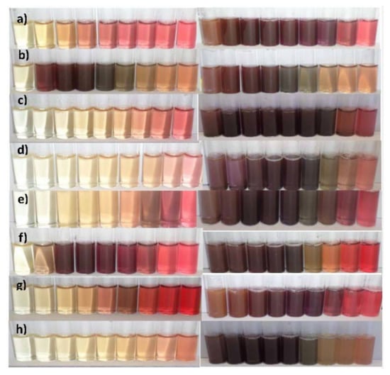 Response of mixtures of Au3+ salt and musts obtained from (a) Cabernet; (b) Garnacha; (c) Juan García; (d) Mencía Secano; (e) Mencía Regadío; (f) Prieto Picudo; (g) Rufete and (h) Tempranillo grapes. Left column corresponds to photographs taken 5 min after the mixture. Right column corresponds to photographs taken 3 h after the mixture. Ten tubes inside each picture correspond to increasing Au3+:must ratios as indicated in Table 1.