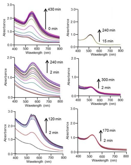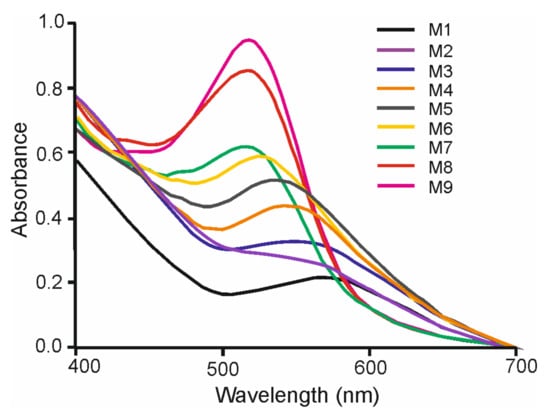 As shown in the previous paragraphs, musts obtained from different varieties of grapes produced different amounts of AuNPs. Changes in color also indicate that some varieties of grape produce faster reactions than others. The kinetics of the reactions was studied using UV-Vis spectroscopy using three Au3+:must ratios (M1, M5 and M9) for the different types of grapes. UV-Vis spectra were registered periodically after the addition of the corresponding must. Results are shown in Figure 6.