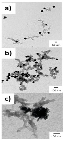 TEM images of the AuNps obtained using Tempranillo must using (a) M1; (b) M5 and (c) M9 ratios.