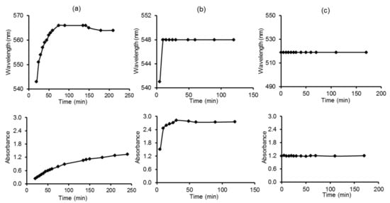Variation of the wavelength and the absorbance with time during AuNPs formation using Tempranillo must (a) M1; (b) M5 (c) M9.