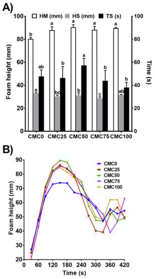 (A) Effect of CMC addition on mean foam height (HM, white), foam stability (HS, grey bars) and time stability (TS, black bars). Error bars represent SD (n = 3 per treatment). Different letters represent statistically significant differences between treatments (post-hoc Tukey test); and (B) the effects of CMC addition on the change in mean foam height over time (n = 3 per treatment).
