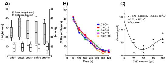 (A) Foam measurements by the free pour method. Effect of CMC addition on maximum foam height (pour height), and time until foam collapsed after pouring (collapse time). (n = 3 per treatment); (B) effect of CMC addition on the change in mean collar width over time (n = 3 per treatment); and (C) third-order polynomial (cubic) curve describing the relationship between CMC addition and mean wine viscosity (cP).