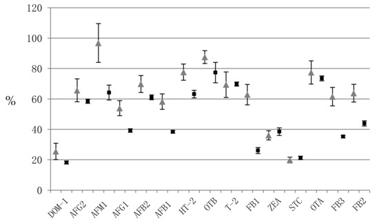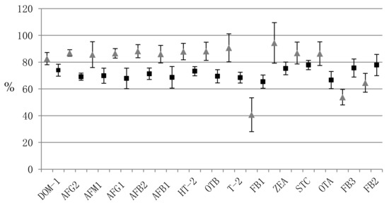 | Mycotoxin | Precision (%RSD) | Accuracy (%RE) | Matrix Effect | Recovery | ||||||||||||||||