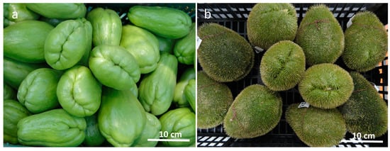 - Cadena-Iñiguez, J.; Soto Hernández, M.; Arévalo Galarza, L.; Avendaño Arrazate, C.; Aguirre Medina, J.F.; Ruiz Posadas, L. Caracterización bioquímica de variedades domesticadas de chayote (Sechium edule (Jacq.) Sw.) comparadas con parientes silvestres. Rev. Chapingo Ser. Horticu. 2011, 7, 45–55. [Google Scholar]