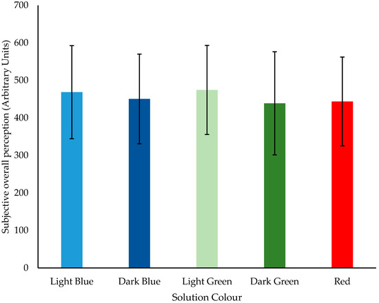 Subjective overall perception (Arbitrary Units) for solution colour, expressed as Mean VAS rating per solution colour ± 1 S.D.