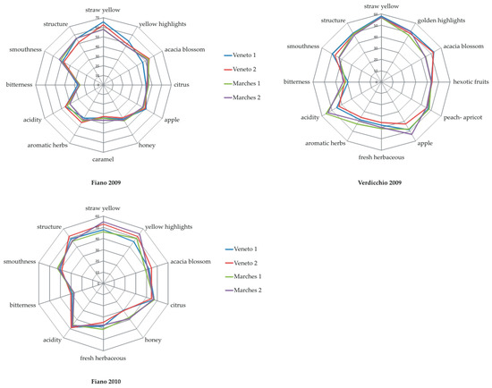 For visual aspect, Verdicchio had golden highlights, while Fiano had yellow highlights. Some olfactory descriptors were common for Fiano and Verdicchio, such as acacia blossom and aromatic herbs. Fiano was characterized by the presence of notes of honey and citrus in both vintages. The 2009 wines were all characterized by aromatic herbs and apple notes.