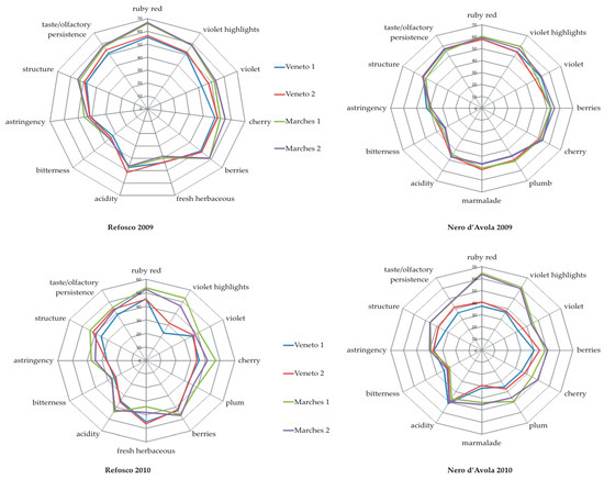 The average sensory profiles of red wines (Figure 2) were more similar than white wines. For visual aspect, the color was ruby red with violet highlights for all the samples, but in 2010 there were high differences in the intensity of these descriptors in the two zones, as confirmed from chemical parameters. Many olfactory descriptors were common, such as violet, cherry, and berries. Refosco was characterized by the presence of notes of fresh herbaceous while Nero d’Avola by plums and marmalade. There were no differences in the descriptors for the two vintages.