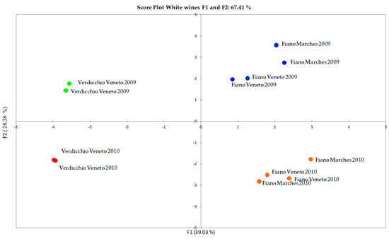 Score plot for white wines (Verdicchio and Fiano) in the two vintages (2009–2010).