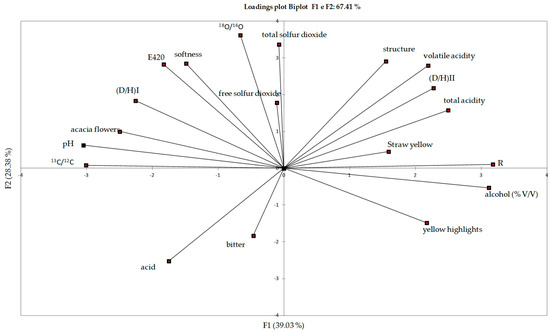 The isotopic parameters (Table 3), the chemical–physical results (Table 4), and the sensory analyses (Figure 1 and Figure 2) constituted a dataset that allowed the study of the wine sample similarities through PCA (Figure 3, Figure 4, Figure 5 and Figure 6).