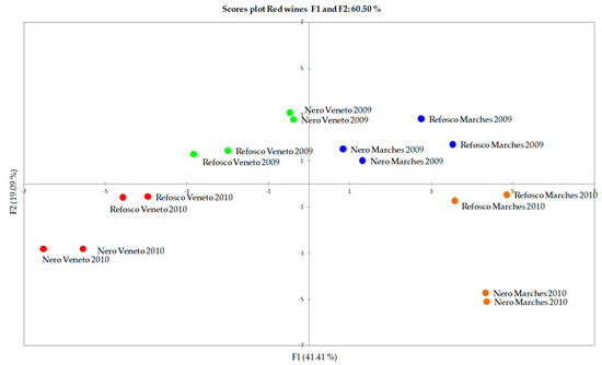 Figure 5 shows the results of the PCA obtained considering all the data of the red wines. These samples are distributed along PC1 according to their production area while PC2 separates the two different vintages. The first two principal components together explain 60.50% of the total variance.
