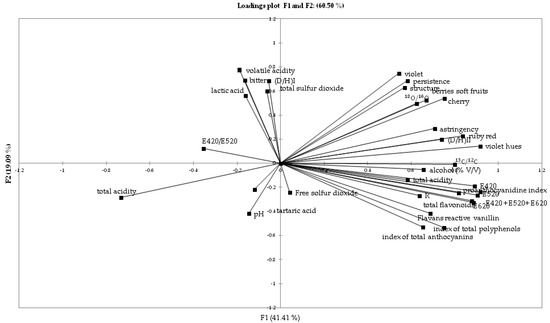 Figure 6 shows the loadings plot that point out the parameters that most affect sample separation. Veneto samples showed a higher total acidity and color hue (E420/E520 ratio). Samples from 2009 vintage had a greater volatile acidity, bitterness, and lactic acid content. However, Marches samples were characterized by a major structure and persistence. These sensory parameters are correlated to the higher concentration of polyphenols, proanthocyanidins, and total flavonoids.