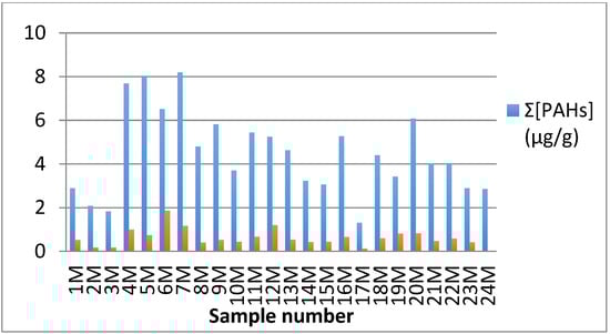 Only two of the analyzed samples (3 M and 14 M) contained seven of carcinogenic PAHs at a mean concentration (0.46 μg/g) that is higher than the accepted range set by EPA [6].