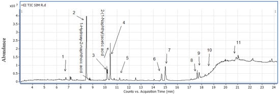 In this study, we also found that the hydroxyl-metabolites from naphthalene and other derivatives of PAHs (not quantified) were found in most samples, which is presented in Table 4 and Figure 2. The source of hydroxyl-metabolites was the chronic exposure of dairy samples to oral soil intake. Londoño et al. concluded that both low and high molecular mass PAHs were transferred to the milk as either native compounds or metabolites after oral exposure [9]. From Table 4 and Figure 2, it was found that 1-hydroxy-2-naphthoic acid (8.45 min) was most abundant, followed by 2-(1-naphthyl)acetic acid (10.42 min), 1-naphthol (10.4 min) and acenaphthene (15.14 min).