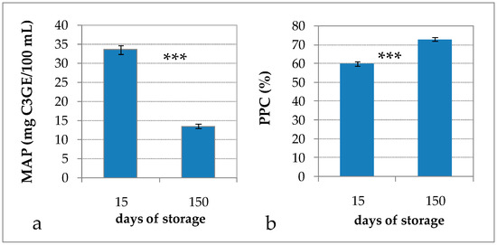 (a) Monomeric anthocyanin pigments (MAP); and (b) percent polymeric color (PPC) of mix-RCW drink after 15 and 150 days of storage. Data are expressed as the mean ± standard error (n = 6). *** Significance of Student’s t-test: exact p-value: <0.0001.