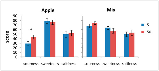 Sourness, sweetness, and saltiness scores for the apple-RCW and mix-RCW drinks after 15 and 150 days of storage. Data are expressed as the mean ± standard error (n = 20). * Significance of Student’s t-test: exact p-value: 0.029.