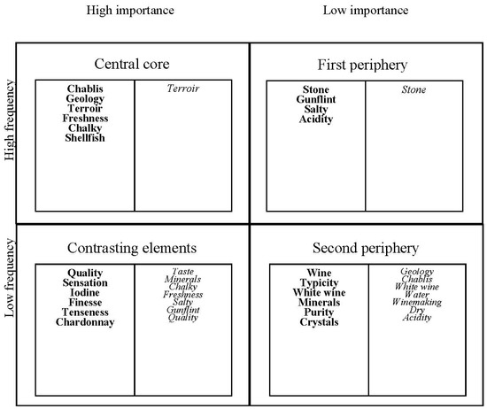 Another approach to investigate the minerality concept was employed by Rodrigues and colleagues [7]. The authors used the theoretical framework of social representation [8], in particular the prototypical structural approach [9,10], to investigate wine professionals’ and wine novices’ minerality cerebral representations. This approach reveals not only the content (different elements or ideas) of the representation but also how these elements are structured [11]. By means of a free word-association task, the authors explored the minerality representation of a group of winemakers and a group of wine consumers, all of them from Burgundy. In addition, participants had to judge the importance and the valence of each elicited word. The combination of the average importance and the frequency of citation of each word gave an idea of its centrality in the representational structure. Results showed quite different representations for winemakers and wine consumers. Hence, the results are reported here in some detail.