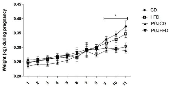 Weight evaluation during the pregnancy in rats from different groups (kg). * Statistically differences by two-ways ANOVA, pos hoc Holm-Sidak (p < 0. 05). CD: control diet; HFD: high fat diet; PGJCD: purple grape juice and control diet; PGJHFD: purple grape juice and high fat diet.
