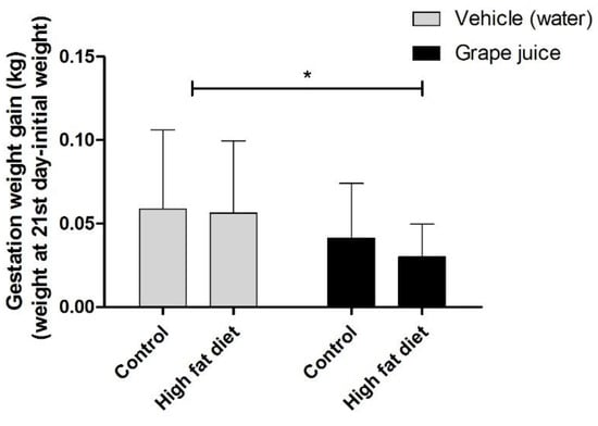 Our study aimed to evaluate the influence of treatment with a high fat diet and grape juice (Vitis labrusca L.) consumption on gestational weight gain, biochemical parameters, and oxidative stress in the serum and liver. Maternal nutrition is of extreme importance to fetus health and to guarantee adequate gestational development, since the nutritional source of the fetus is exclusively derived from the mother’s alimentary ingestion [21]. Excessive weight gain during pregnancy has been associated with the development of gestational diabetes, labor difficulties, and risk to the fetus in the perinatal period [5].