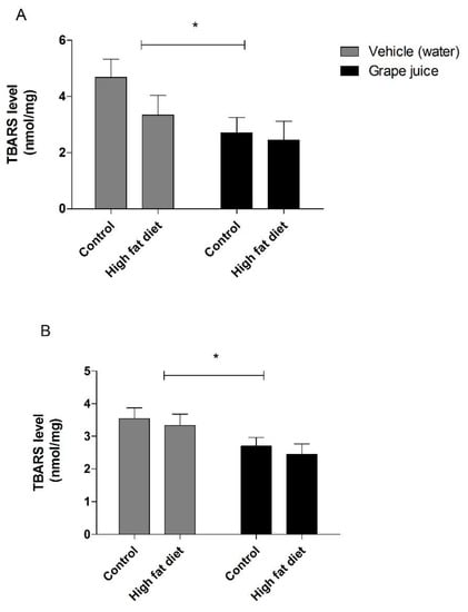Levels of TBARS (nmol/mg of protein) in serum (A) and liver (B) in female rats after the lactation period from different groups. The results are expressed as mean ± SEM. * Statistical difference according to ANOVA two-way, followed by post-test Holm-Sidak (p < 0.05). CD: control diet; HFD: high fat diet; PGJCD: purple grape juice and control diet; PGJHFD: purple grape juice and high fat diet.