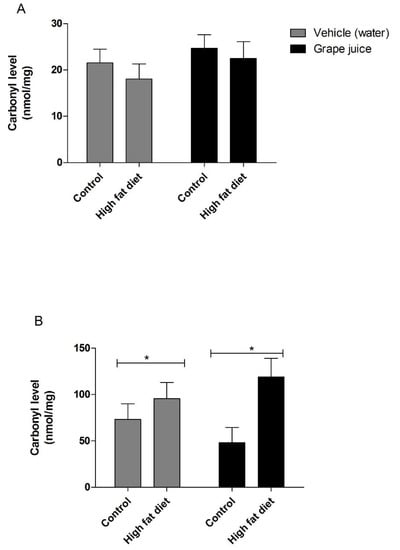Levels of Carbonyl (nmol/mg of protein) in serum (A) and liver (B) in female rats after the lactation period from different groups. The results are expressed as mean ± SEM. * Statistical difference according to ANOVA two-way, followed by post-test Holm-Sidak (p < 0.05). CD: control diet; HFD: high fat diet; PGJCD: purple grape juice and control diet; PGJHFD: purple grape juice and high fat diet.