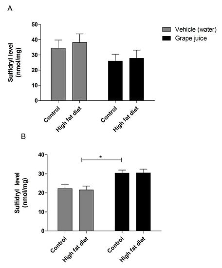 Levels of Sulfidryl (nmol/mg of protein) in serum (A) and liver (B) in female rats after the lactation period from different groups. Results are expressed as mean ± SEM. * Statistical difference according to ANOVA two-way, followed by post-test Holm-Sidak (p < 0.05). CD: control diet; HFD: high fat diet; PGJCD: purple grape juice and control diet; PGJHFD: purple grape juice and high fat diet.