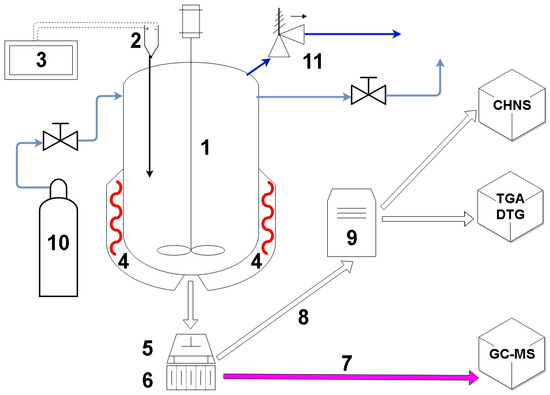 Diagram of the test rig used for hydrothermal carbonization (HTC) of the spent grain. (1)—Autoclave; (2)—type K thermocouple; (3)—PLC controller; (4)—heating mantle, with band heaters; (5)—hydraulic press; (6)—filter; (7)—liquid after mechanical de-watering; (8)—hydrochar after mechanical de-watering; (9)—dryer; (10)—nitrogen for purging; (11)—pressure relief valve.