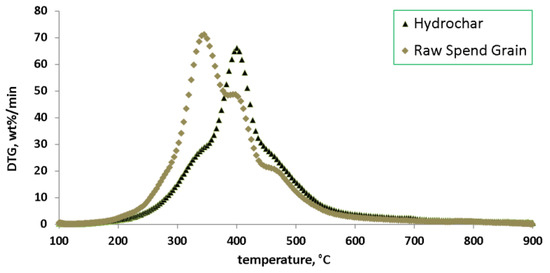 DTG diagram of raw spent grain and corresponding hydrochar.