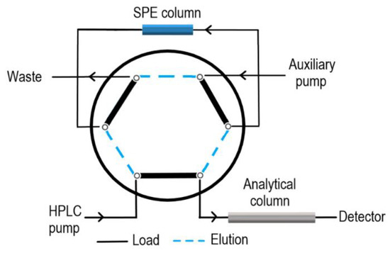 When SPE is coupled to LC, the system configuration consists of extraction and analytical columns, switching valves, and auxiliary pumps (Figure 1). When the valve is in the load position, the sample is introduced into the SPE column, which has been preconditioned with appropriate solvents; then, the valve is changed to the elution position and the analytes are transferred to the analytical column, through the mobile phase, to be separated and detected. The analytes can be eluted in two modes: Straight-flush or back-flush. In the first mode, the analytes are eluted in the same direction in which they were loaded, and in the second mode, the analytes are eluted in the opposite direction to avoid band-broadening [33].