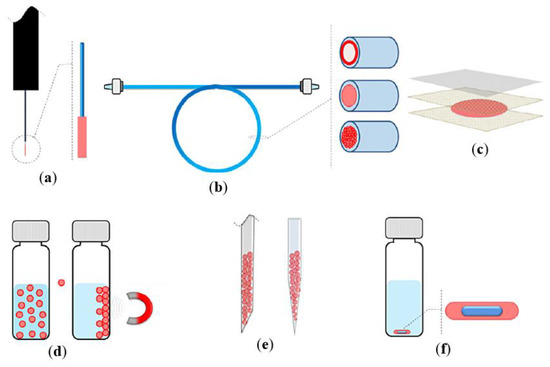 Main solid-phase microextraction configurations: (a) fiber; (b) in-tube; (c) thin film; (d) magnetic; (e) pointer; and (f) stir bar. Adapted from Reference [45]. Reproduced by permission from Elsevier.