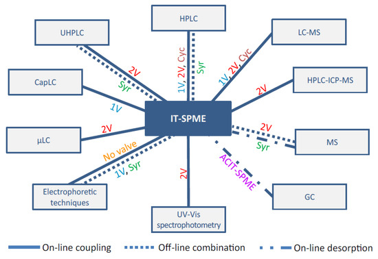 One of the most important advantages of in-tube SPME devices is the on-line coupling with LC systems, which leads to reduced analysis time, operating costs and sample manipulation, thus improving sensitivity, reproducibility, and precision of the analytical method [62]. Even though in-tube SPME was originally conceived for LC applications, it can also be on-line coupled directly to UV-vis [63], and direct analysis in real time (DART-MS) [64], or off-line with MALDI-TOF [65,66] detectors. Fernández-Amado et al. [67] recently provided a comprehensive overview of the strengths and weaknesses of in-tube SPME, showing the possible different couplings and configurations, and new developments made within this technique (Figure 3).