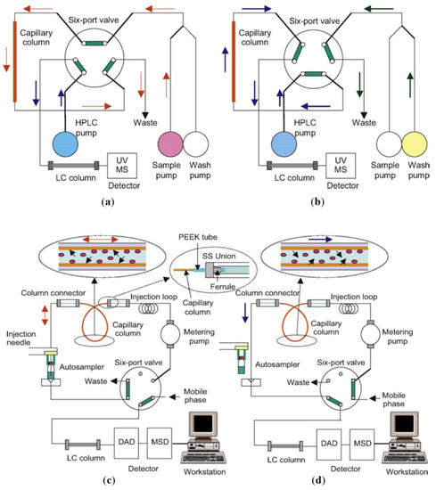 Schematic diagram illustrating the automated on-line in-tube SPME/HPLC technique. Flow-through extraction system (a) load position (extraction) and (b) inject position (desorption); and draw/eject extraction system (c) load position (extraction) and (d) inject position (desorption). Adapted from Reference [5]. Reprinted by permission from Elsevier.