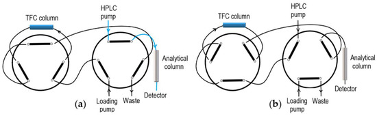 This technique uses different configurations, but due to high sample complexity, the most common one uses a column switching system on-line with a LC system coupled to either MS or tandem MS [79]. The standard configuration requires two six-port valves, a loop, an auxiliary pump and an LC-MS system (Figure 5). Extraction and analysis are carried out in three steps: Loading, elution, and conditioning. Briefly, in the valve extraction position, the sample is loaded from the injector to a TFC column under turbulent conditions. Under these conditions the small molecules (<2000 Da) diffuse more quickly between the porous particles, allowing chemical interaction with the stationary phase and separated by size exclusion from large molecules (e.g., proteins), which are discarded to the waste while the small molecules are retained in the extraction column. Then, the valve switches to elution position and the molecules retained are transferred from TFC column to an analytical column by the mobile phase, to be subsequently separated and detected. Once transferred, the valve switches and the TFC column is washed and conditioned for the next run [79].