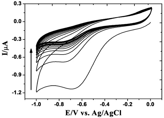 Figure 1 illustrates the repetitive CV cycles for the electrochemical reduction of GO-modified GCE. The voltammogram shows a cathodic reduction wave at around −0.68 V in the first cycle which was ascribed to the reduction of the surface oxygen groups [33]. During the second cycle, the reduction wave is shifted negatively and its current starts to drop exceptionally. On progressing the CV scans, the decrease of current continues until a stable baseline current is reached. This indicates that the surface-oxygen species are successfully reduced.