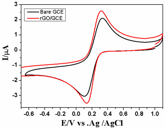 In order to investigate the electrochemical properties of the concerned electrodes (the bare GCE and rGO/GCE), cyclic voltammetric measurements were performed using [K3Fe(CN)6] as the electrochemical probe. Figure 2 presents the cyclic voltammograms obtained by the two studied electrodes of 1 mM [K3Fe(CN)6] solution in 0.2 M KCl solution. On comparing the bare GCE with the rGO/GCE, the redox peak currents increase, whereas the peak-to-peak separation (ΔEP) decreases using the rGO/GCE. The observed values of ΔEP for the bare and modified GCEs are 172 and 83 mV, respectively. This clearly reveals that the electron transfer on the rGO surface is much easier than for the bare GCE. This might be due to the large surface area as well as the high electric conductivity of rGO. The electrochemical properties of the modified GC electrode were investigated by CV.