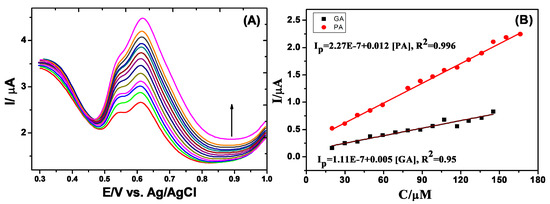 Furthermore, the linear variations range from 20 to 144 µmol·L−1 for GA and from 20 to 166 µmol·L−1 for PA, with detection limits (S/N = 3) of 30.8 µmol·L−1 for GA and 10.2 µmol·L−1 for PA. Also, the limits of quantitation (LOQ, S/N = 10) obtained are 93.4 µmol·L−1 for GA and 31.0 µmol·L−1 for PA. These results illustrate that the proposed sensor possesses good analytical performance and the simultaneous quantification of GA and PA in the samples can be done successfully by the voltammetric method.