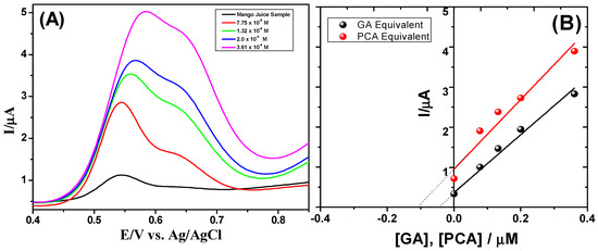 The GA and PA content in a commercial mango sample was determined with the developed square wave voltammetric method in order to validate the use of the sensor based on the rGO/GCE for the simultaneous determination of GA and PA in a real sample. The standard addition method was employed in order to quantify the quantities of the gallic and protocatechuic acids in the sample with standard solutions of the acids using the earlier described method, considering the optimal parameters, and then the voltammograms were recorded. The obtained results are shown in Figure 6. In these experiments, successive amounts of standard GA and PA solutions were added to the test solution. The total content of GA and PA in the dried commercial mango sample is expressed as milligrams of GA and PA equivalents. It was estimated to be 2.4 mg·g−1 dry weight (DW) and 5.4 mg·g−1 DW for GA and PA, respectively.
