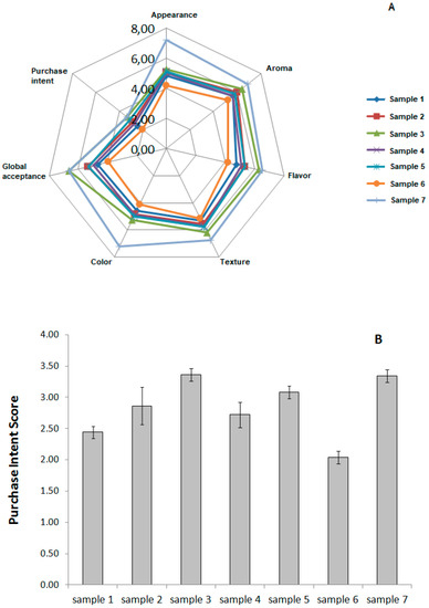 The highest values for sensory acceptance were found for formulations 3 and 7, based on the appearance, overall acceptance and shake texture (Figure 1A). Regarding the intention of purchase test, there were higher values in the intention to buy for formulations 3 and 7 (Figure 1B), where formulation 3 contains 10% sweet potato flour and formulation 7 contains 15% maltodextrin. These results show the possibility of developing this product with good acceptance values.