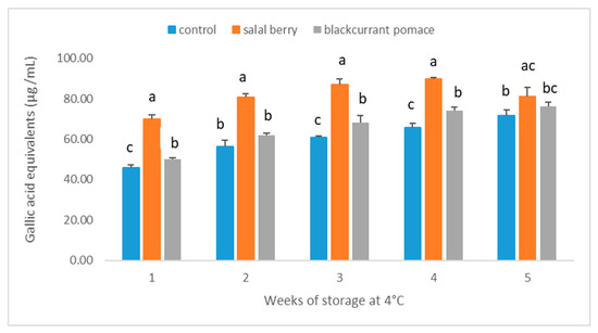 Total phenol content of yogurt beverages during cold storage. Results are presented as means ± SD. Different low case letters denote significant differences at each time point (p < 0.05).